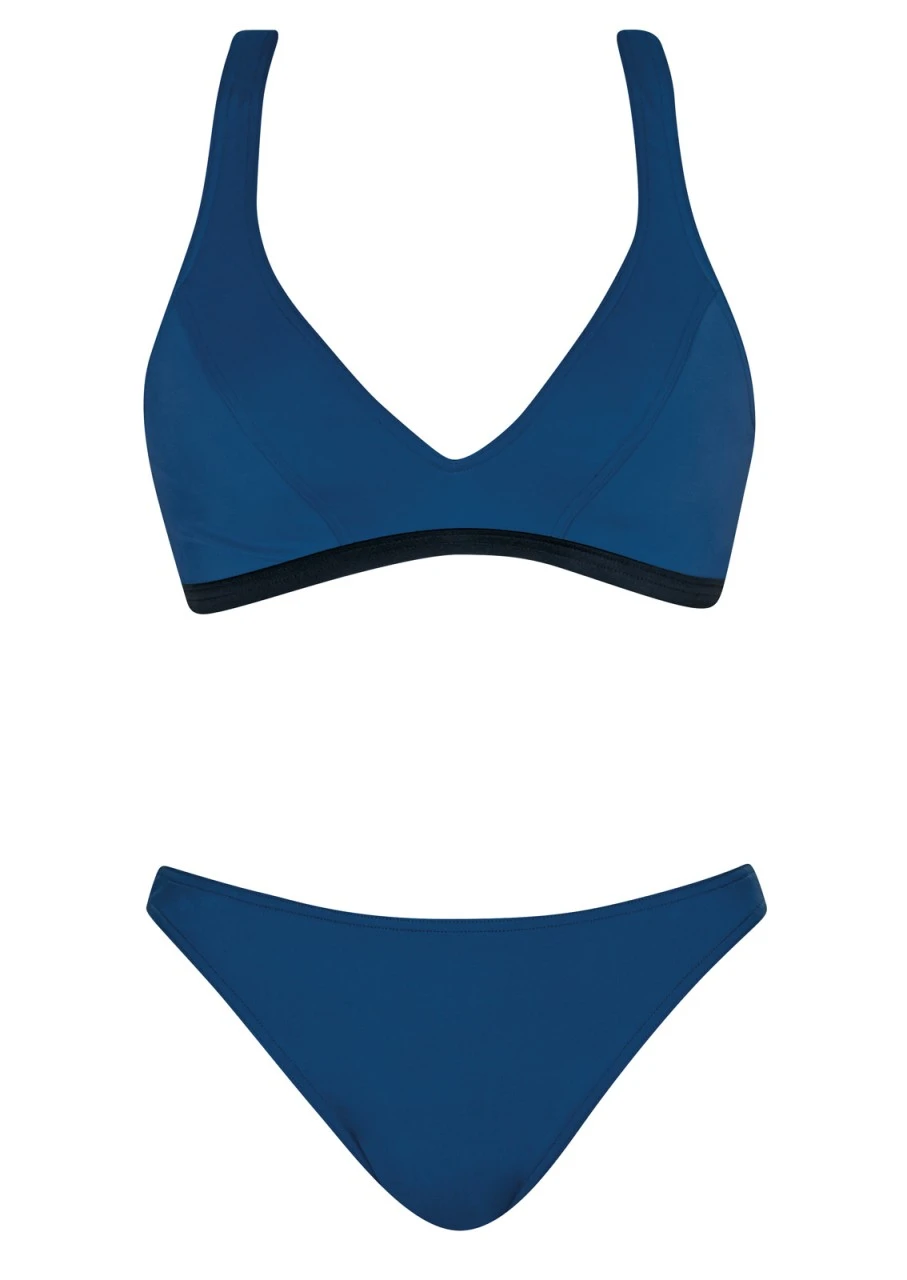 Sportiven Chic zeichnet den zweifarbigen Bikini in Blau/Schwarz aus. Das Top ist mit einer bequemen Futterstütze ausgestattet. Absolut stylisch sind die Netz-Träger in Kombination mit den verschlungenen Bändern am Rücken. Der schmal geschnittene Slip vervollständigt den Zweiteiler. Das Top eignet sich zusammen mit der Hose SURFER GIRL als Yoga-Outfit.