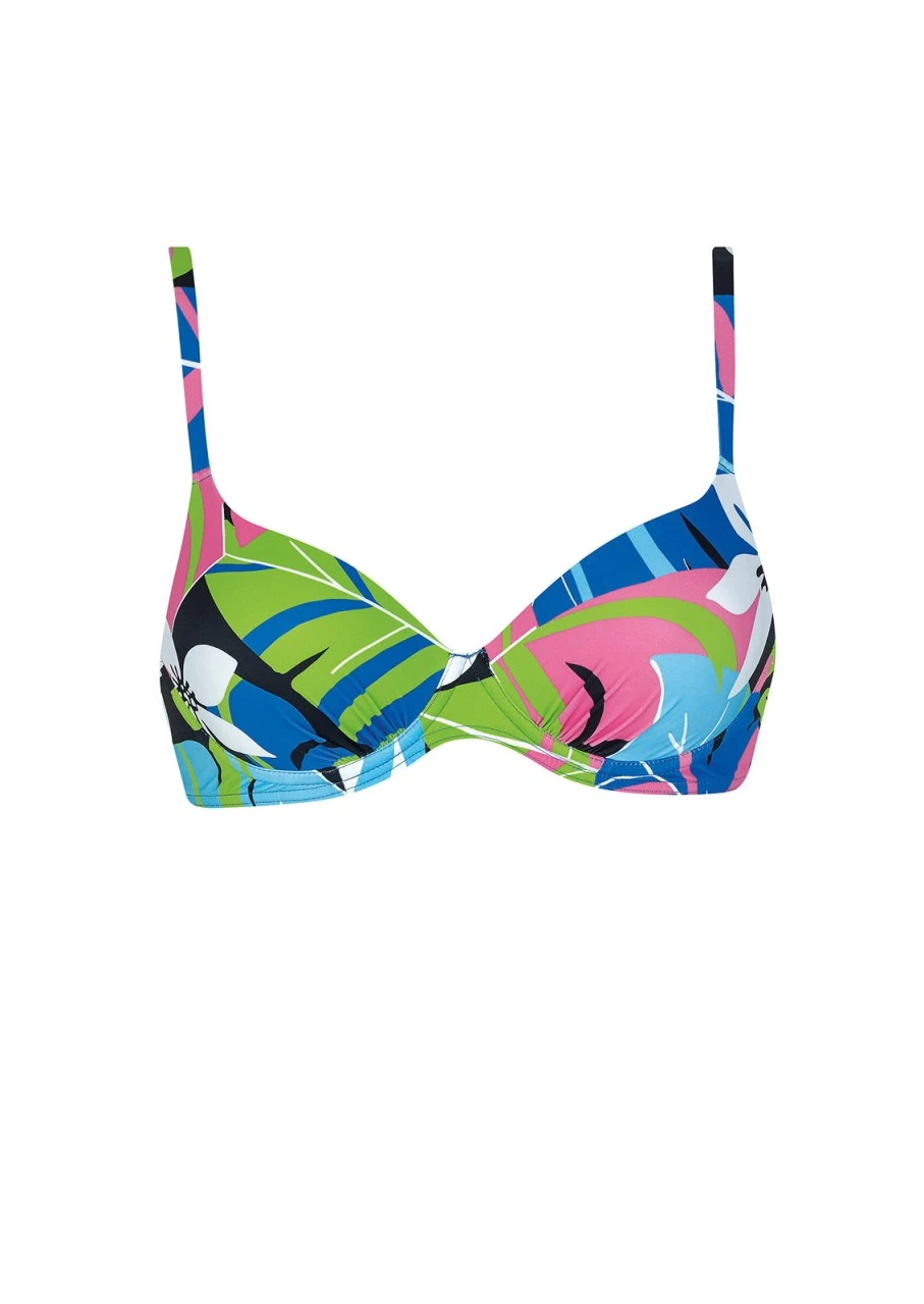 Leuchtende Blätter in Neon-Farbe auf Schwarz. Sehr schöne Form dank Formbügel und Softschalen. Verstellbare Träger zum Aushaken – jung und feminin.