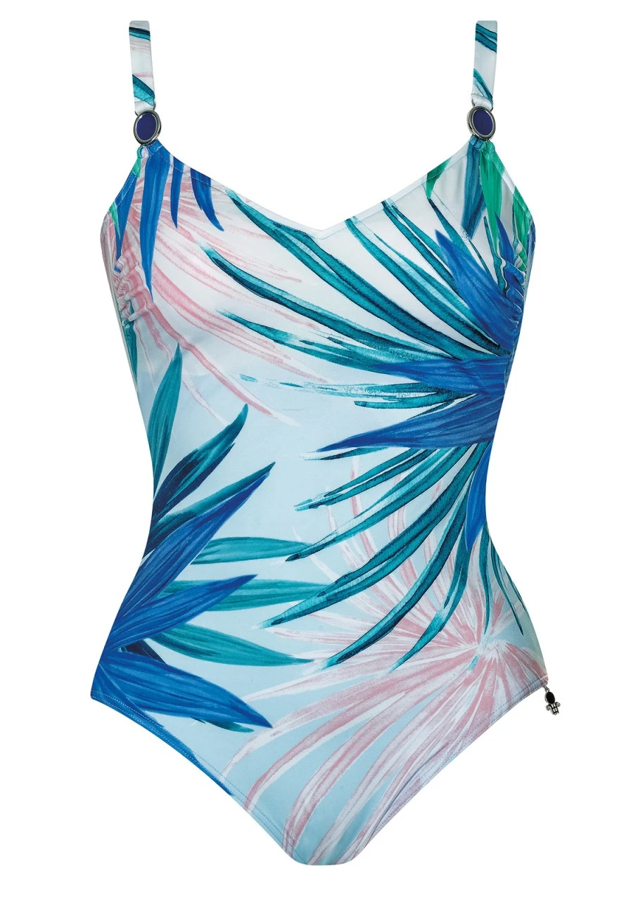 Kräftige Blätter wie aus übermütigem Pastell gezaubert, in Blau, Grün und zartem Rosa auf cremeweißem Grund. Ein klares, dezent farbiges und umwerfend schönes Design. Badeanzug mit Softschalen und verstellbaren Trägern mit prächtigem, metallgefasstem Stein-Einsatz.