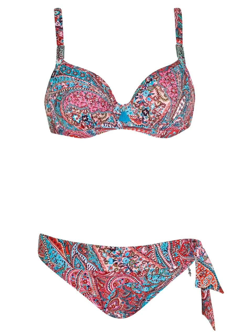 Verspieltes Paisley-Muster in zarten Pastelfarben – ein zauberhaftes Design für tolle Bademode. Bikini mit Spacer-Cup und Formbügel. Die mit schönen Zierteilen versehenen Träger sind verstellbar und am Rücken zum Aushaken. Das schönes Zierteil „Pompon“ in der Farbe Türkis am Bikini-Top unterstreicht das tolle Design der Serie. Ein Slip – zwei Styles. Durch den breiten Bund kann die Hose variabel getragen werden: bauchkaschierend, mit nach oben geklapptem Bund oder sexy mit nach unten geklapptem Bund. Verziert ist der Slip mit einer Schleife.