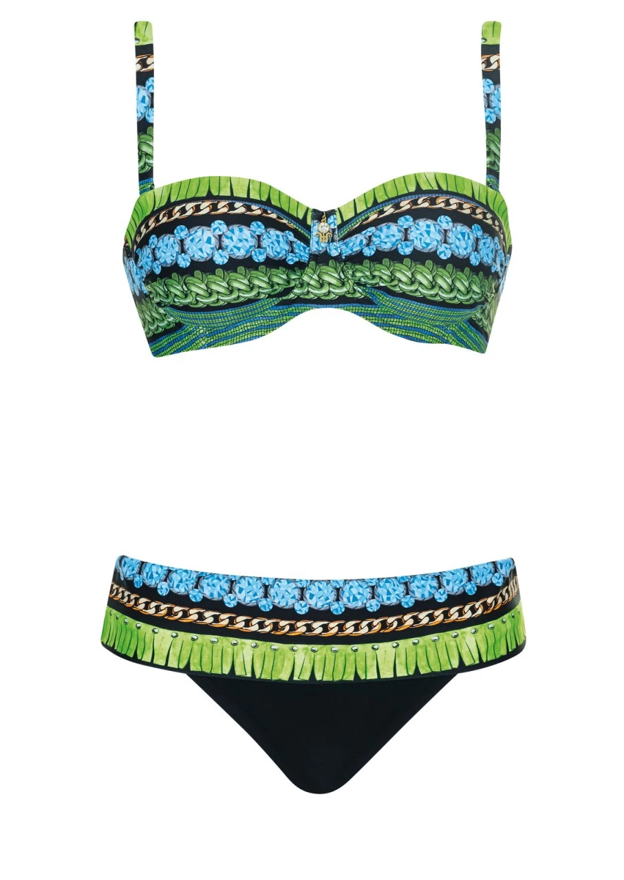 Edelstes Schwarz, darauf ein luxuriöser Print von Fransen, Edelsteinen, Karos und Ketten. Eine junge, stilvolle Serie. Bandeau-Bikini. Softschalen und Formbügel sorgen für ein schön geformtes Dekolleté und angenehmen Halt auch ohne Träger. Die längenverstellbaren Träger sind sowohl vorne als auch hinten zum Aushaken – so entstehen viele Trage-Varianten: Mit oder ohne Träger, überkreuzt oder im Nacken gebunden. Schwarzer Slip mit Umschlagbund im Design der Serie. Durch den breiten Bund kann die Hose variabel getragen werden: bauchkaschierend, mit nach oben geklapptem Bund oder sexy mit nach unten geklapptem Bund.