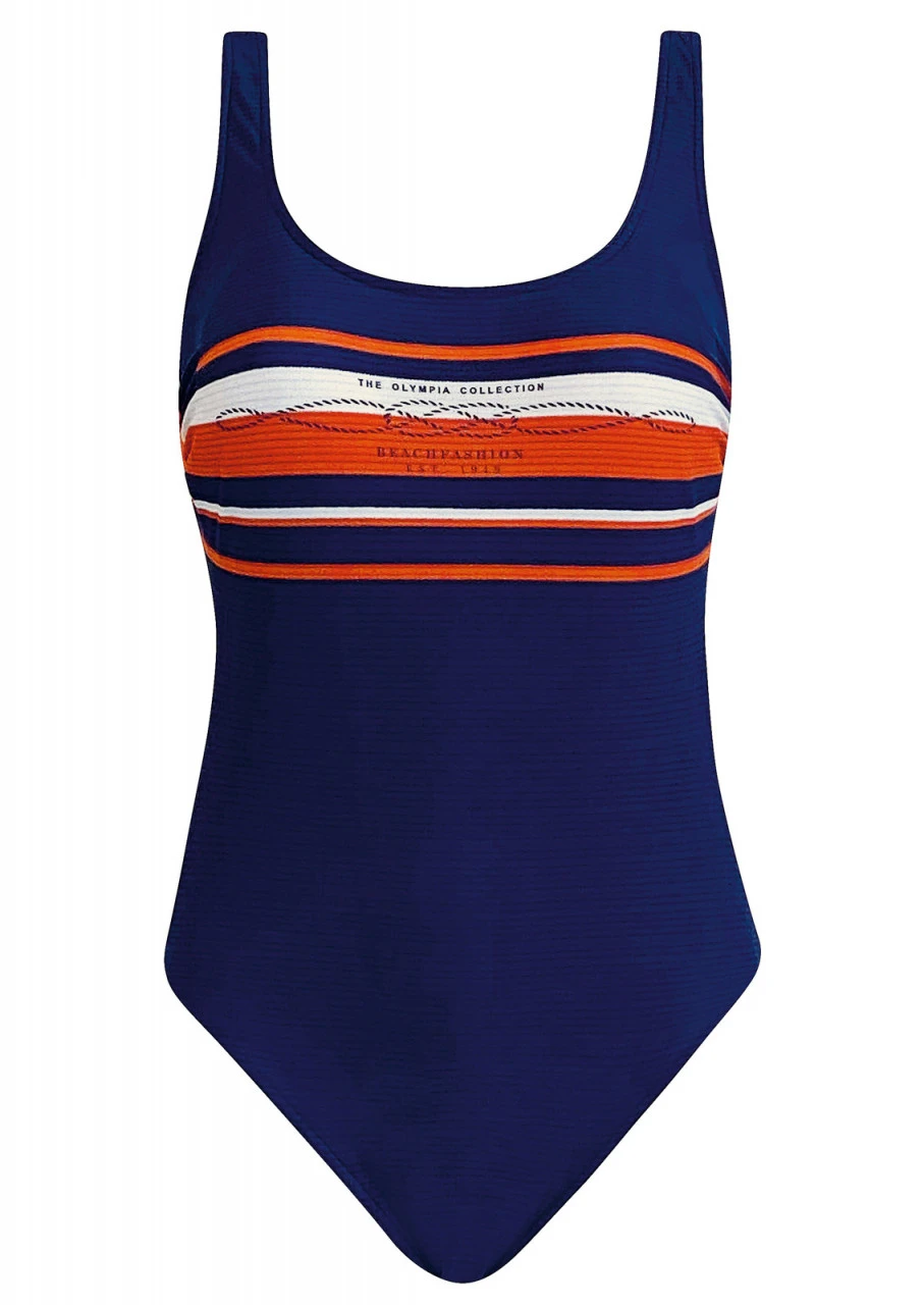 Immer schön, immer aktuell, immer top! In sich gemusterte Streifen in Blau, Orange und Weiß. Ein unkompliziertes Design für schöne Stunden am und im Wasser. Badeanzug mit Softschalen und einem tiefen Rückenausschnitt. Schönes Detail: Aufdruck „The Olympia Collection“ auf der Brust. Nachhaltige Bademode: OLYMPIA® GOES NEXT LEVEL – Bademode aus recyceltem Material.