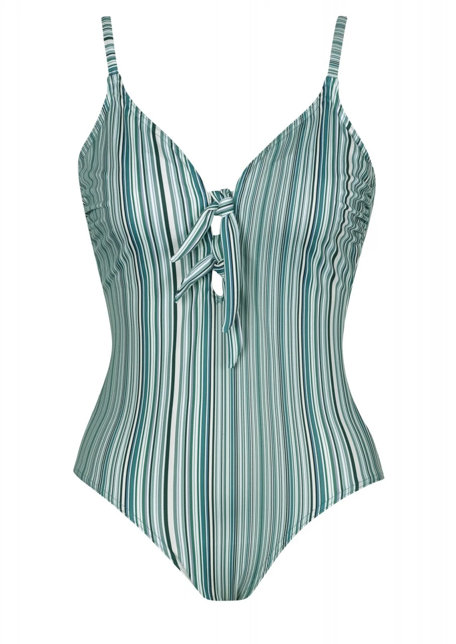 Der Sommer ist einfach easy! Leichte Pastellfarben und ein unkompliziertes Design mit unterschiedlich breiten Streifen und Linien – so einfach wie der Sommer! Badeanzug mit Softschalen und einem tiefen Rückenausschnitt. Die Träger sind verstellbar. Schöner Eyecatcher ist das tief ausgeschnittene Dekolleté, dieses wird mit zwei Bändern gehalten und ist mit Zierschleifen geschmückt. Der Einteiler ist komplett gefüttert. Durch diese Vollfütterung garantiert der Einteiler zusätzlichen Halt und ist besonders blickdicht. Nachhaltige Bademode: OLYMPIA® GOES NEXT LEVEL – Bademode aus recyceltem Material.