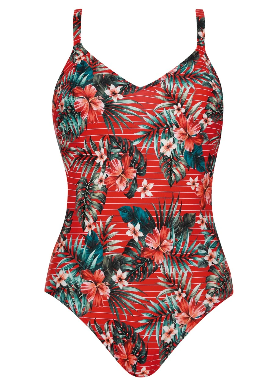 Süße Kombination aus frechen rot-weißen Querstreifen und Hawaii-Print mit Palmblättern und Hibiskusblüten. Ein traumhaft schönes Design für Badenixen, Sonnenanbeterinnen und Urlaubsfans. Badeanzug mit Softschalen. Der V-Ausschnitt setzt feminine Akzente. Die Träger sind verstellbar und am Rücken zum Aushaken, somit können die Träger über Kreuz getragen oder im Nacken gebunden werden. Der tiefe Rückenausschnitt ermöglicht Ihnen zusätzlich einen schön gebräunten Rücken. Nachhaltige Bademode: OLYMPIA® GOES NEXT LEVEL – das Polyamid für den Oberstoff ist zu 100 % aus recycelten Fasern.