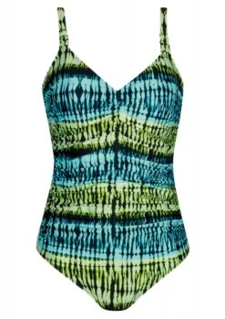 Edelstes Schwarz, darauf zauberhaft verschwommene Längsstreifen im Batik-Style in Helltürkis und Hellgrün, diese sind zudem in Farbblöcken angeordnet. Ein exklusives sowie stilvolles Design. Badeanzug mit Softschalen und einem tiefen Rückenausschnitt. Die verstellbaren Träger sind mit einer dekorativen Drappierung geschmückt. Der Einteiler ist durch die leichten Raffungen an der Vorderseite besonders trage- und figurfreundlich. Der Badeanzug ist komplett mit Futter unterlegt.