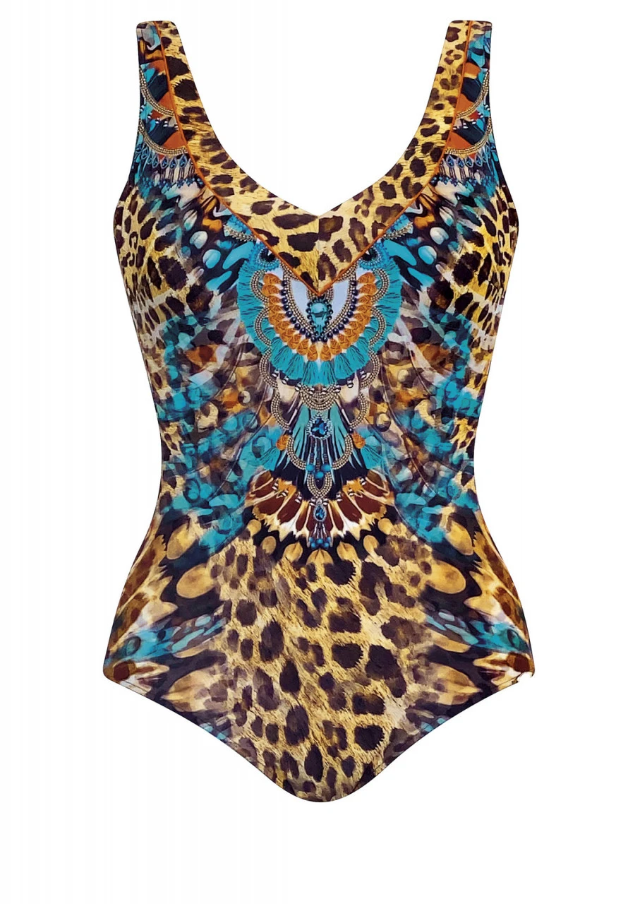 Leopardenmuster kombiniert mit Federn, Schmucksteinen und üppigem Ketten. Ein atemberaubend schöner Druck. Badeanzug mit Softschalen und stützender sowie formender Halbcorsage. Der Blendeneinsatz am Ausschnitt bietet ein dezentes Dekolleté. Tiefer Rückenausschnitt.
