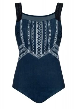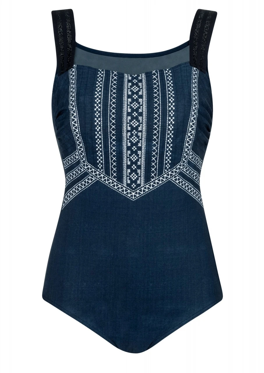 Wie handgestickt! Filigraner, weißer Print im Boho-Look auf einem nachtblauen Hintergrund in Jeansoptik! Chic und lässig zugleich. Badeanzug mit Softschalen aus unserer Mastectomy-Serie. Die sehr schöne, hochgezogene Schnittform mit Netzeinsatz sorgt für einen sicheren Sitz und der Brustansatz bleibt unsichtbar. Beidseitige Taschen ermöglichen das Einschieben der Prothesen und schützen sie vor Herausfallen. Tolles Detail sind die elastischen, gestreiften Träger. Hoher Rückenausschnitt. Der Einteiler ist komplett gefüttert. Durch diese Vollfütterung garantiert der Einteiler zusätzlichen Halt und ist besonders blickdicht.