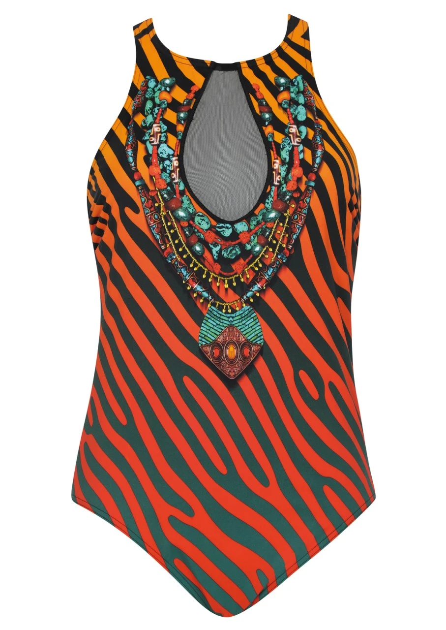 Shades of Orange! Unwiderstehlicher Print mit Farbverlauf und schwungvollen Diagonalstreifen, kombiniert mit einem üppigen Kettenprint im Ethno-Stil. Ein unvergleichliches Design in kräftigem Orange. Spektakulärer Badeanzug mit schwarzen Netzeinsatz und einem hochgezogenen Dekolleté im amerikanischen Stil. Schöner, tief geschnittener Rückenausschnitt in Tropfenform. Der Einteiler ist im Nacken mit einem Verschluss zu schließen. Badeanzug mit bequemer Futterstütze. Diese sorgt für einen angenehmen Halt und ein gutes Körpergefühl. Nachhaltige Bademode: Das Polyamid für den Oberstoff ist zu 100 % aus recycelten Fasern.