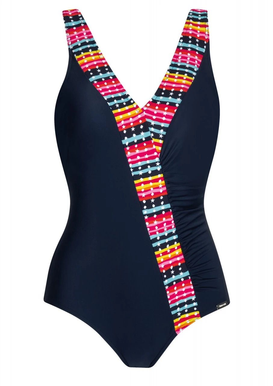 Stützender Badeanzug in Nachtblau mit Softschalen und Halbcorsage. Die diagonal angebrachte, gestreifte Blende unterstützt die Wirkung der Halbcorsage und streckt optisch die Figur. Tiefer Rückenausschnitt.