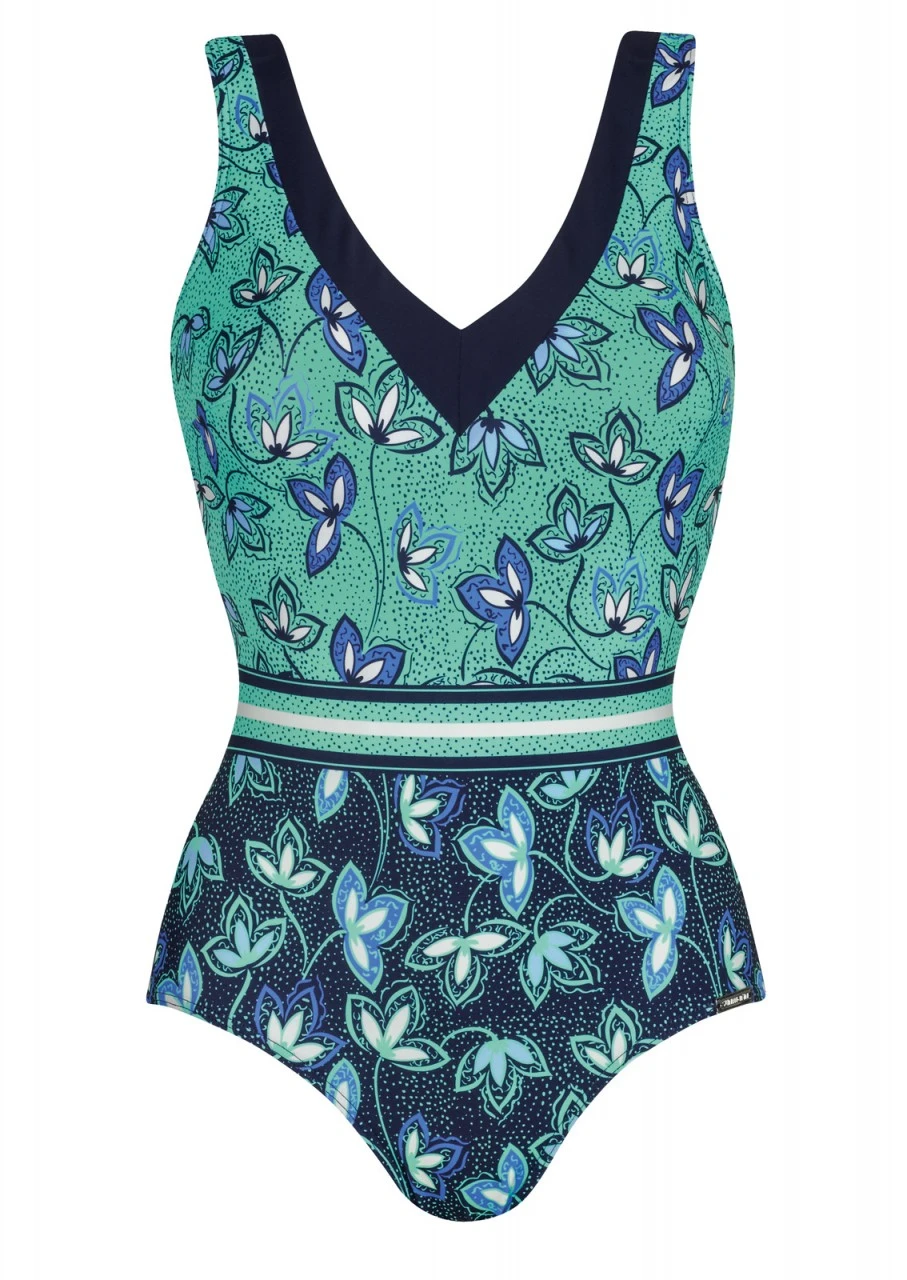 Ob auf Hawaii oder im heimischen Schwimmbad, das zauberhafte Design mit Punkten und zarten Blumen in Türkis, Nachtblau und Weiß passt immer und überall. Stützender Badeanzug mit Softschalen und Halbcorsage. Die Unifarbene Blende am V-Ausschnitt streckt die Figur optisch. Die Querstreifen in Gürteloptik lassen die Taille optisch schlanker wirken. Die Rückseite des Einteilers hat einen tiefen Rückenausschnitt und ist in der Farbe Nachtblau.