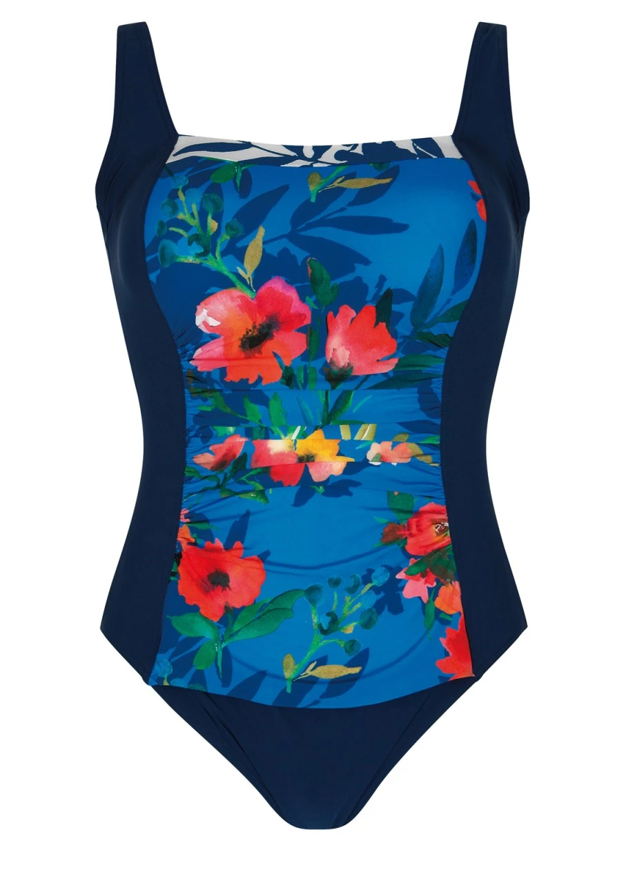 Wie ein Aquarell auf Ihrer Haut! Blüten und Blätter in Aquarelloptik auf einem strahlenden Blau. Ein wunderschöner und romanischer Print. Figurschmeichelnder Badeanzug mit Softschalen und einem geraden Ausschnitt. Unifarbig abgesetzte Einsätze lassen die Figur optisch schlanker wirken. Figurumspielende Raffungen im Vorderteil zaubern dazu eine wunderschöne Silhouette. Die Träger sind passgenau in der Länge verstellbar. Ein hoher Rücken rundet das Gesamtbild ab und bietet zusätzlichen Halt. Die Rückseite des Einteilers ist in der Farbe Nachtblau.