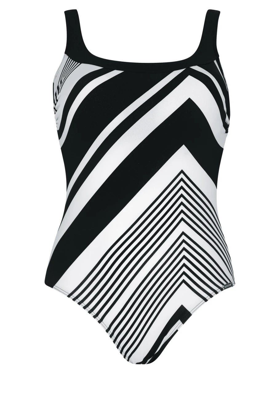 Lässiges Design in Schwarz/Weiß mit attraktiven Diagonalstreifen. Mastectomy-Badeanzug mit Softschalen. Das höher geschlossene Dekolleté sorgt für einen sicheren Sitz und der Brustansatz bleibt unsichtbar. Beidseitige Taschen ermöglichen das Einschieben der Prothesen. Die Träger sind passgenau in der Länge verstellbar. Der Einteiler ist aus einem chlorresistenten Material gearbeitet, das selbst hoher Beanspruchung trotzt und der Trägerin lange Freude bereitet. Zudem bietet es hervorragende Trageeigenschaften und kürzeste Trocknungszeiten. Die Rückseite des Einteilers hat einen tiefen Rückenausschnitt und ist in der Farbe Schwarz gehalten.