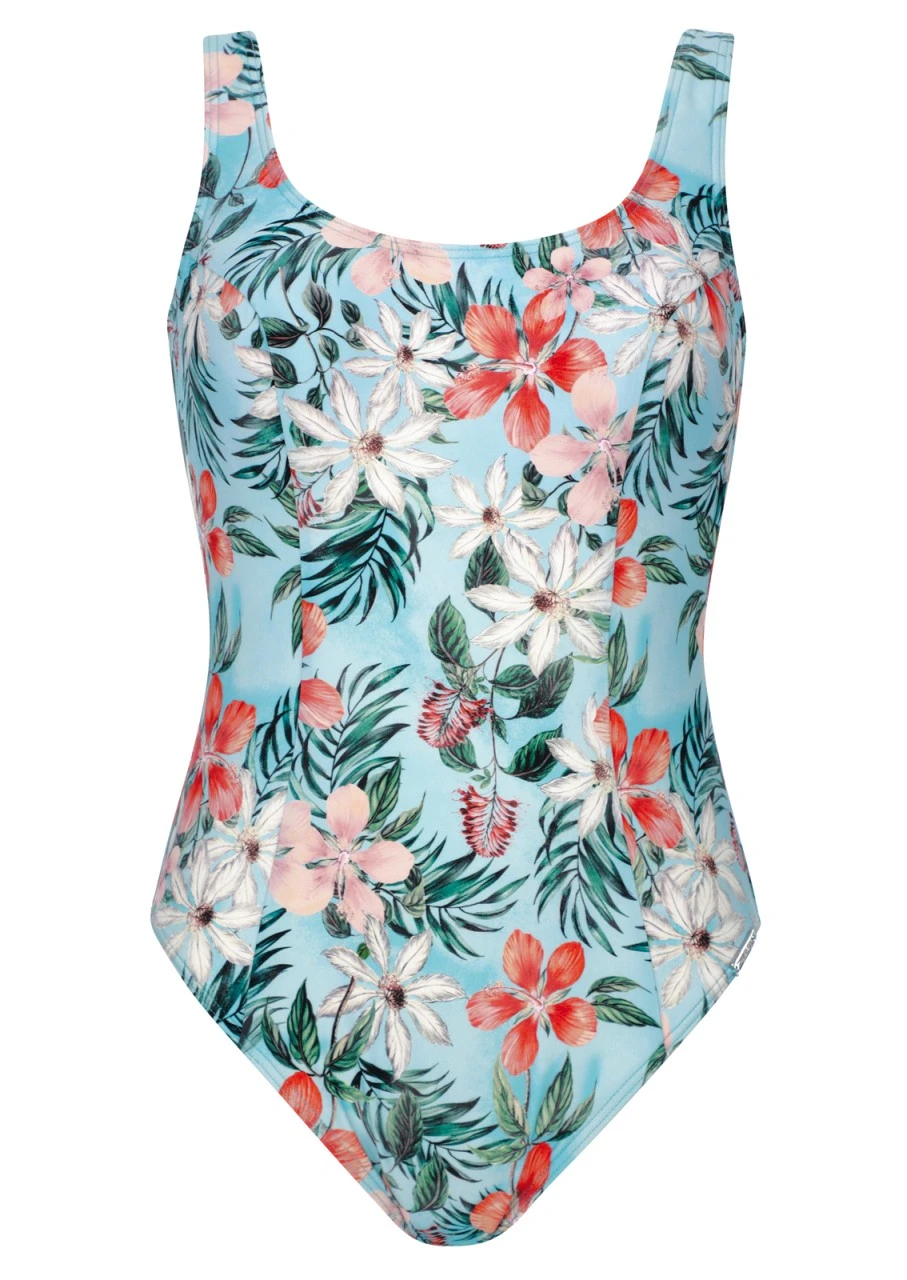 Wundervoller Hawaiiprint mit tropischen Blumen und Palmblätter auf zartem Himmelblau. Ein romantisches und feminines Design, dass Sie sofort in Urlaubsstimmung bringt. Badeanzug mit Softschalen. Wiener Nähte zieren, für eine figurbetonende und taillierte Optik, die Vorderseite. Ein tiefer Rücken rundet das Gesamtbild ab. Dieser Badeanzug ist komplett mit Futter unterlegt, sodass auch im nassen Zustand ein Durchscheinen der Haut vermieden wird.