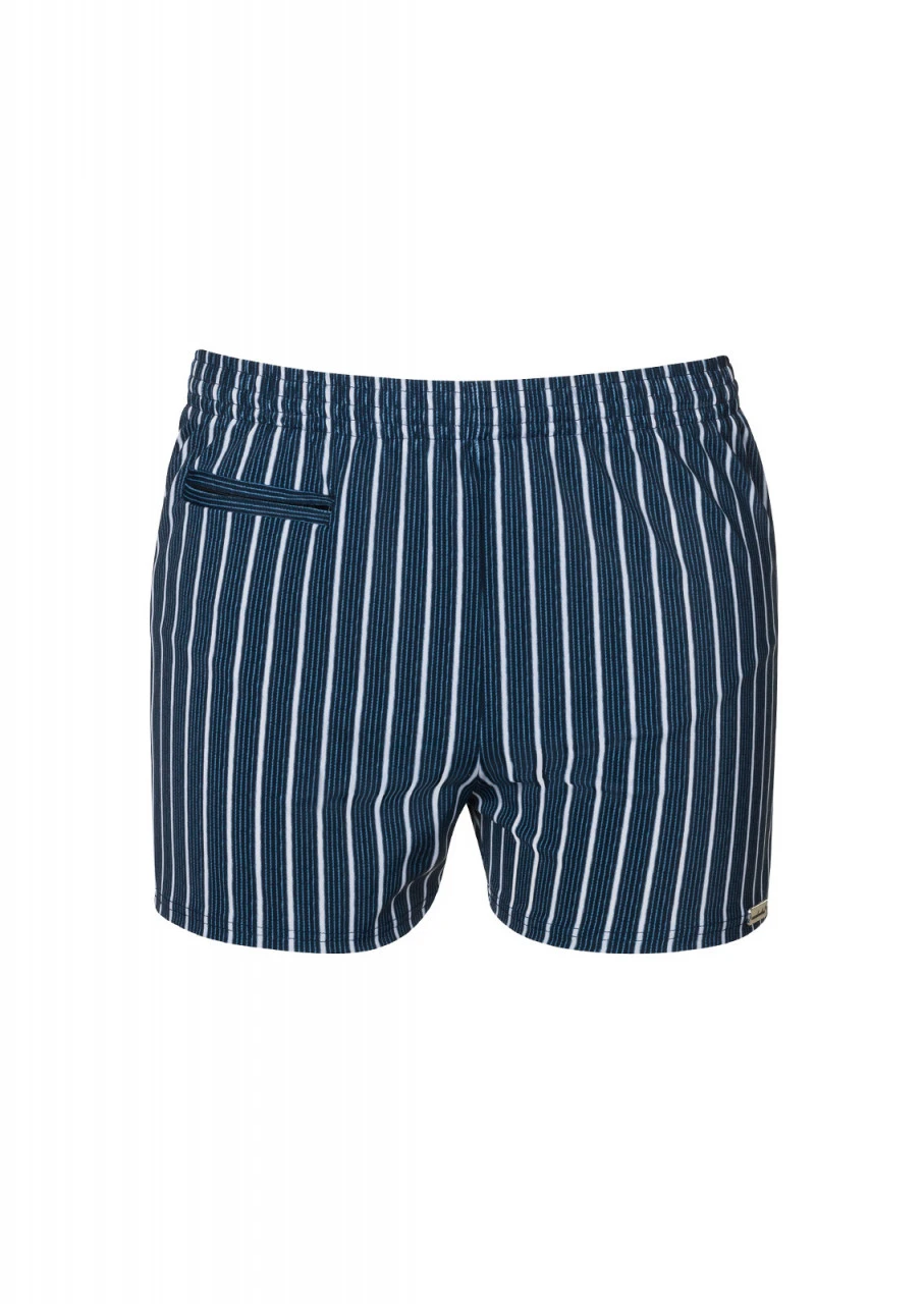 Klassisches Design! Nachblauer Hintergrund mit weißen und hellblauen Längsstreifen. Boyshorts in zeitlos schönem Design. Die Badehose ist mit Gummizug, Innenslip und Reißverschlusstasche auf der rechten Vorderseite ausgestattet. Ein innenliegender Kordelzug trägt zu einer optimalen Passform bei.