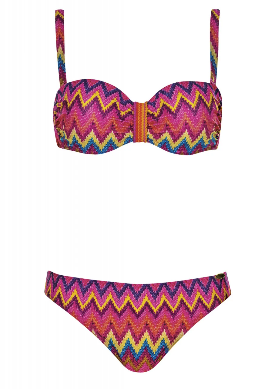 Knallige Farben! Farbenfrohes Zickzackmuster in Weboptik in leuchtenden Farben: Pink, Rot, Gelb, Violet, Orange und Türkis. Jung und frisch und herausstechend aus der Menge! Bikini mit Softschalen und Formbügel im Bandeau-Stil. Die Träger sind verstellbar und abnehmbar. Hüfthose mit schmaler Seitenhöhe. Tolles Detail: Farbenfroh gestreiftes, elastisches Baumwollband am Ausschnitt.