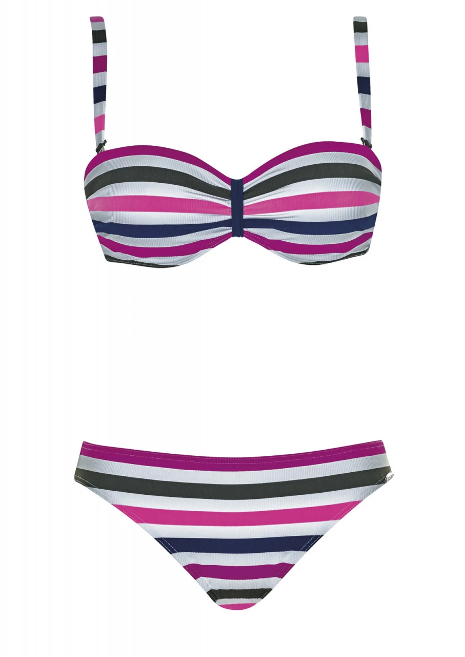 Der Sommer ist einfach easy! Unkompliziertes Streifendesign in Weiß, Blau, Pink, Purpur und Khaki – so schön und einfach wie der Sommer. Die kräftige, gerippte Struktur im Material gibt eine unvergleichliche Optik und Haptik. Bandeau-Bikini mit Softschalen und Formbügel. Die verstellbaren Träger sind abnehmbar. Hüfthose mit schmaler Seitenhöhe.