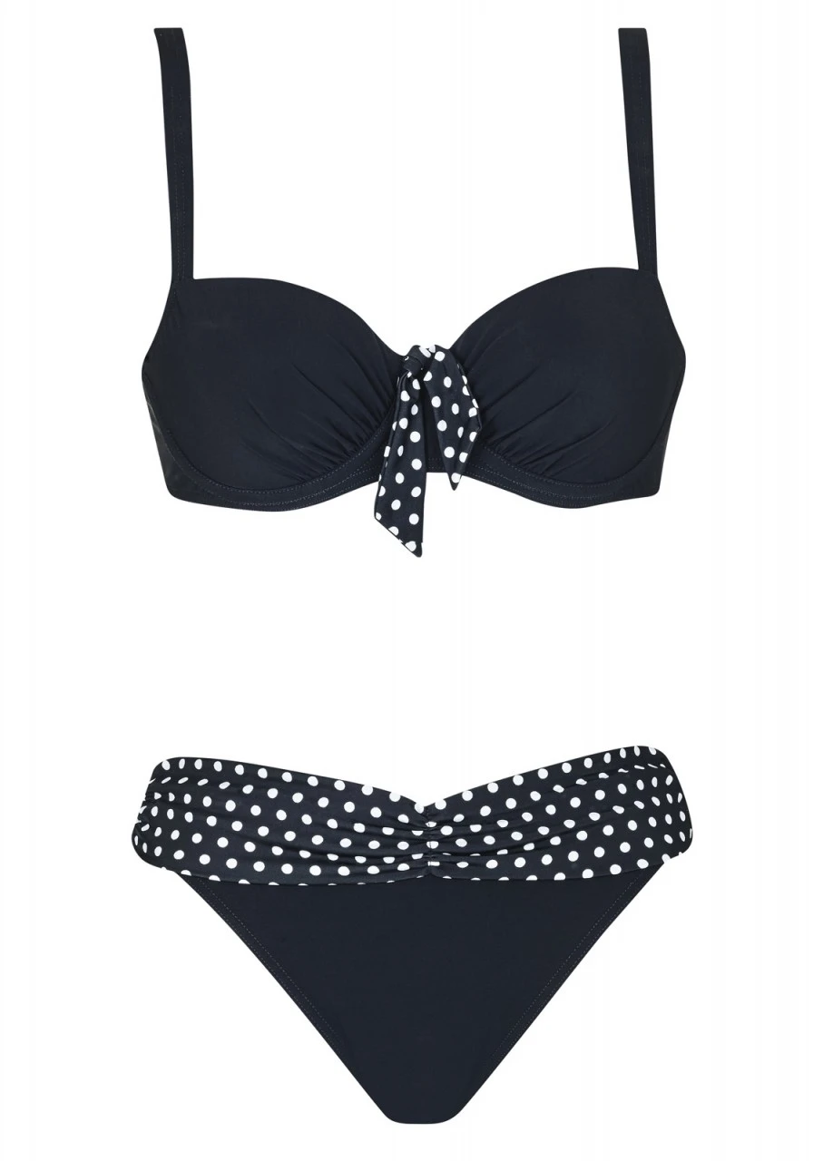 Schwarz trifft niedliches Retro-Tupfen-Design. Zauberhafter Bikini mit Softschalen und Formbügel, diese bringen das Dekolleté optimal zur Geltung. Tolles Highlight: Die im Retrolook gepunktete Schleife am Dekolleté und geraffte Hosenblende. Die Träger sind in der Länge verstellbar sowie aushakbar. Slip in klassischer Form.