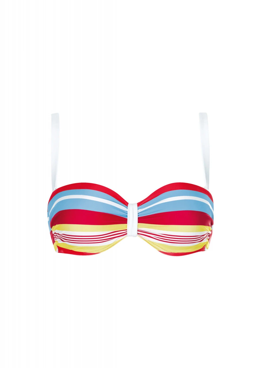 Es ist ganz einfach: Streifen-Design in Rot, Weiß, Hellblau und Gelb in unterschiedlichen Stärken. So entsteht ein unkompliziertes und frisches Design. Bandeau Bikini-Top mit Softschalen und Formbügel. Die Träger sind verstellbar und abnehmbar. Nachhaltige Bademode: OLYMPIA® GOES NEXT LEVEL – Bademode aus recyceltem Material.
