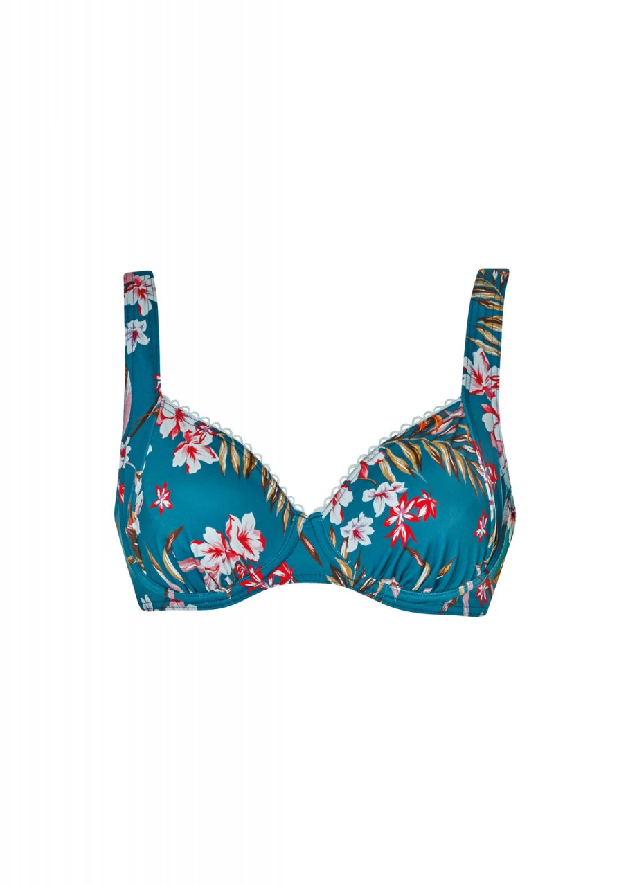 Herrliche Blüten und Palmblätter auf taubenblauem Grund. Jung, frisch und einfach wunderschön! Bikini-Top mit Formbügel und Petticoatstütze. Die Träger sind verstellbar und an der Rückseite aushakbar. Schönes Detail: Niedliche, weiße Borte am Dekolleté. Nachhaltige Bademode: OLYMPIA® GOES NEXT LEVEL – Bademode aus recyceltem Material.