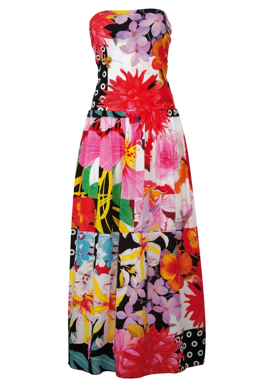 Spektakulärer, großformatiger Blüten- und Blätterprint in den schönsten Sommerfarben. Ein zauberhafter, femininer Print – so prachtvoll wie ein großer, bunter Blumenstrauß. Wunderschöner Multistyle-Rock. Tragbar als wadenlanger, weitschwingender Rock oder als Bandeau-Strandkleid mit knieumspielender Länge. Dank des Umschlagbundes lässt sich der Multistyle-Rock im Handumdrehen verwandeln.