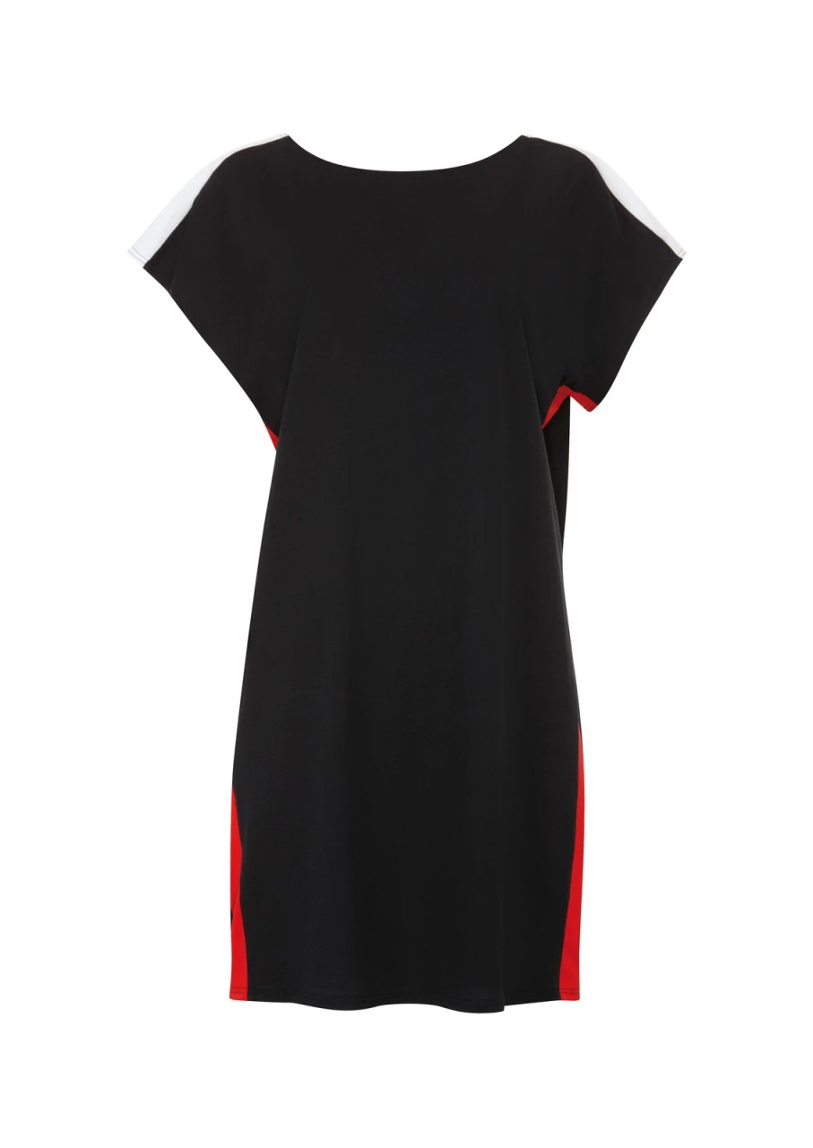 Schwarzes T-Shirt-Kleid mit lässigem, geradem Schnitt. Die kontrastfarbenen Zierbänder an den Seiten und Armen lockern das Design auf und geben den modischen Schick. Das Shirt in Mini-Länge, kurzen Armen und Rundhalsausschnitt ist ein tolles Cover-Up – perfekt für einen Badetag im Freibad, am Badesee oder Strand!