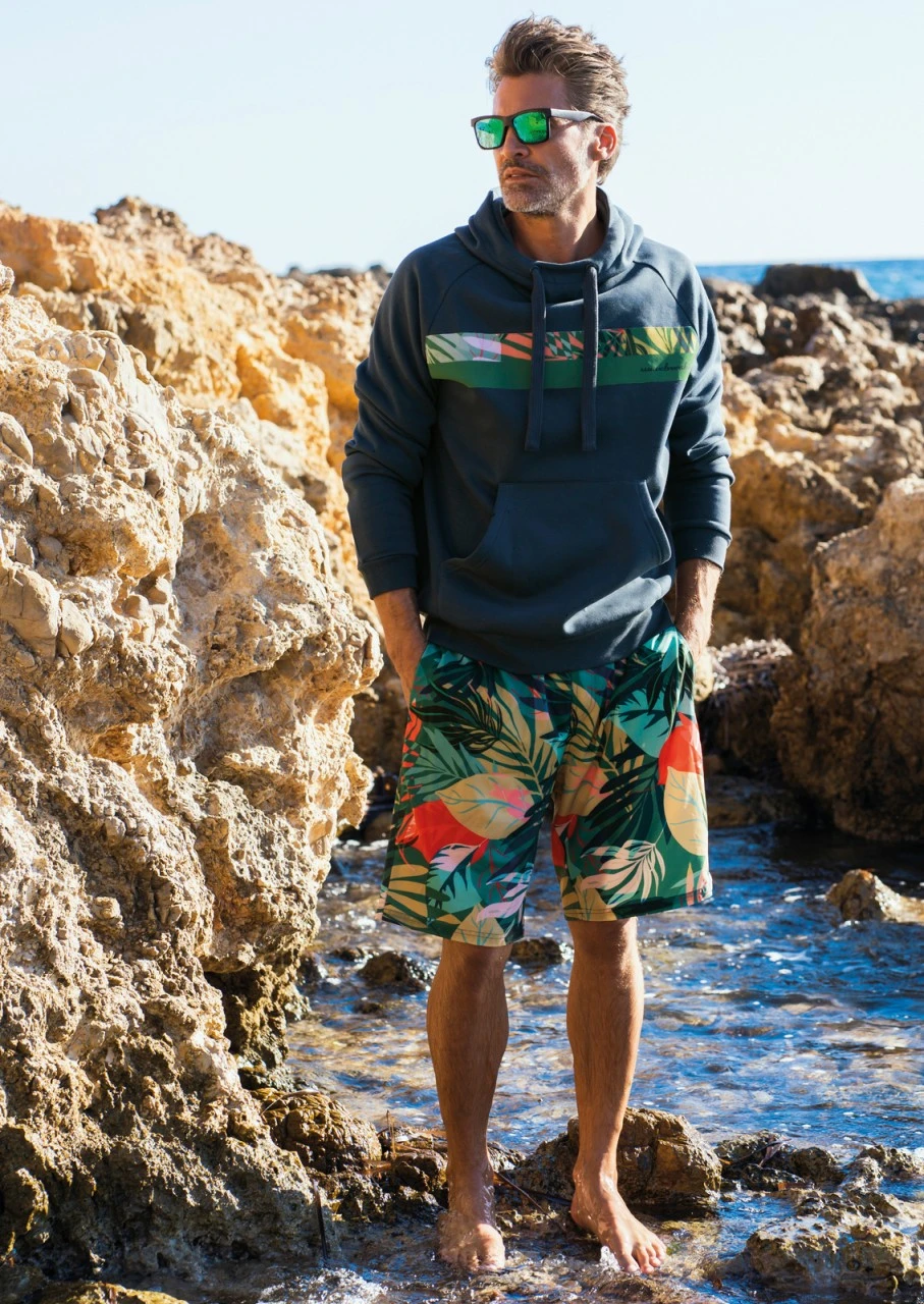 Coole Board Shorts mit einem farbenprächtigen Dschungelprint. Die etwas länger geschnittene Shorts ist mit seitlichen Eingriffstaschen ausgestattet. Am elastischen Hosenbund mit innenliegendem Kordelzug befindet sich eine Zier-Schlaufe, an der ein Karabinerhaken befestigt werden kann. Für ein extrem komfortables Tragegefühl sorgt die Innenshorts aus einzigartigem Komfortfutter. Hier überzeugt das besonders weiche Material und die raffinierte Schnittform. Shorts aus weicher und schnelltrocknender Microfaser-Qualität. So fühlen sich Männer wirklich wohl.