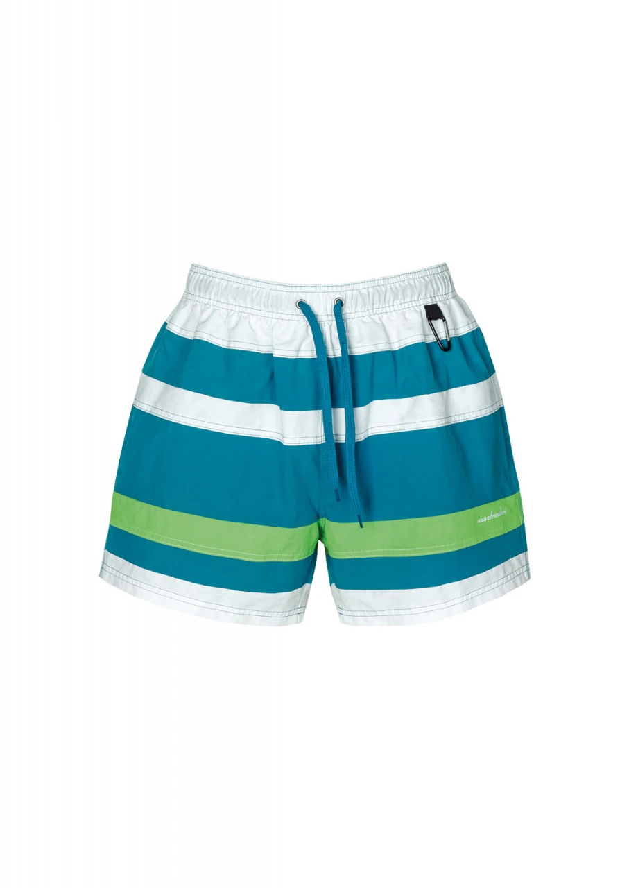 Badeshorts mit einem lässigen Streifendesign und Schnürung mittig am Bund. An einer Schlaufe am Hosenbund befindet sich als funktionales Accessoire ein Karabinerhaken. Praktisch sind die seitlichen Eingriffstaschen. Für ein extrem komfortables Tragegefühl sorgt die eingearbeitete Innenshorts aus super-weichem Komfortfutter mit raffiniertem Schnitt. So fühlen sich Männer wirklich wohl. Shorts aus weicher und schnelltrocknender Microfaser-Qualität. Erhältlich in zwei Farbvarianten: Blau/Weiß/Orange und Türkis/Weiß/Hellgrün.