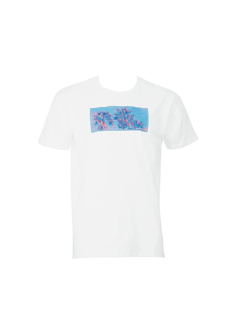 Kurzarm T-Shirt mit Rundhalsausschnitt mit einem verwischten Palmenprint auf der Brust. Für ein angenehmes Tragegefühl sorgt das verwendete Material aus 100 % Bio-Baumwolle.
