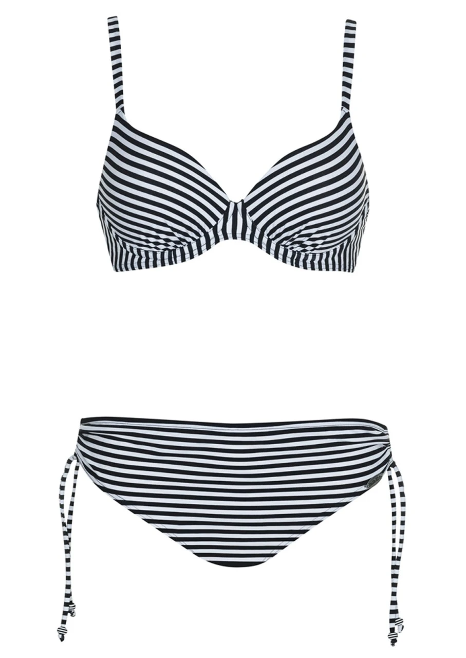Feine Linien in Schwarz-Weiß. Ein Design, so einfach wie der Sommer! Bikini mit Formbügel, Softschalen und verstellbaren Trägern zum Aushaken. Die Hose ist seitlich in der Breite verstellbar.