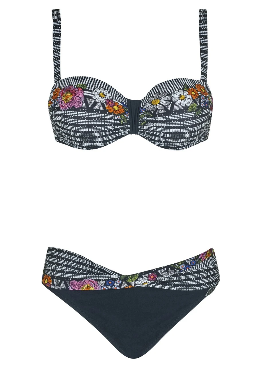 So lovely! Schwarzer Untergrund, darauf gewellte Linien und Streifen, Pünktchen und Quadrate in Weiß, kombiniert mit einem verspielten Blüten- und Blätterdruck. Bandeau-Bikini mit Softschalen, Formbügel und verstellbaren Trägern zum Abnehmen. Slip mit Blende in Gürtel-Optik.