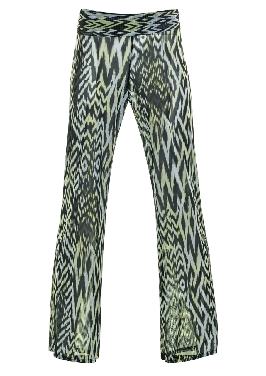 Die pure Verlockung! Schwarzer Hintergrund mit verwischtem Karo und Zickzack-Muster in Weiß, Hellgelb und Dunkelgrün. Ein geniales Design voller Leichtigkeit. Passend zur Serie CARIBBEAN TEMPTATION eine weite, bequeme sowie transparente Hose.